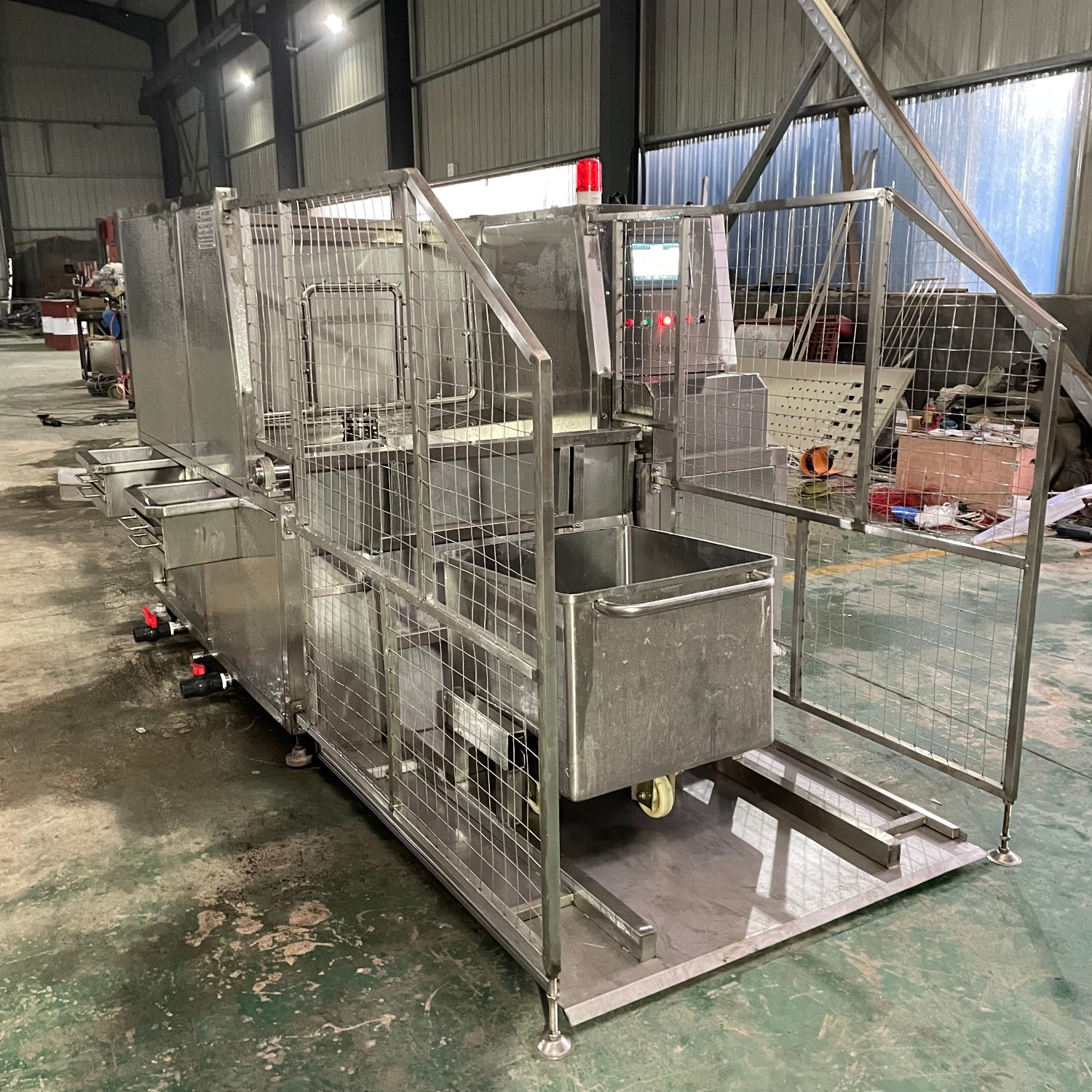 該設(shè)備包含清洗和漂洗腔,以及上料和卸料設(shè)備。清洗用的水過濾后再循環(huán)使用。漂洗用的水量可進(jìn)行調(diào)節(jié),達(dá)到滿意的節(jié)水效果。電子清洗劑劑量系統(tǒng)可在清洗過程中控制清洗劑添加的過程。結(jié)構(gòu)緊湊,帶安全護(hù)軌,光電系統(tǒng)使得操作人員在操作時的安全性得到保障。帶轉(zhuǎn)臂,臂上帶清洗噴嘴,所有肉車的表面都得到非常細(xì)致的清洗效果。結(jié)構(gòu):不銹鋼結(jié)構(gòu)、不銹鋼清洗泵、水加熱系統(tǒng): 蒸汽、帶清洗轉(zhuǎn)臂清洗過程中多重保護(hù)、帶上料和卸料系統(tǒng)、封閉的水循環(huán)系統(tǒng),帶過濾系統(tǒng)。在每個單獨的操作中,清洗過程都可調(diào)整和控制。